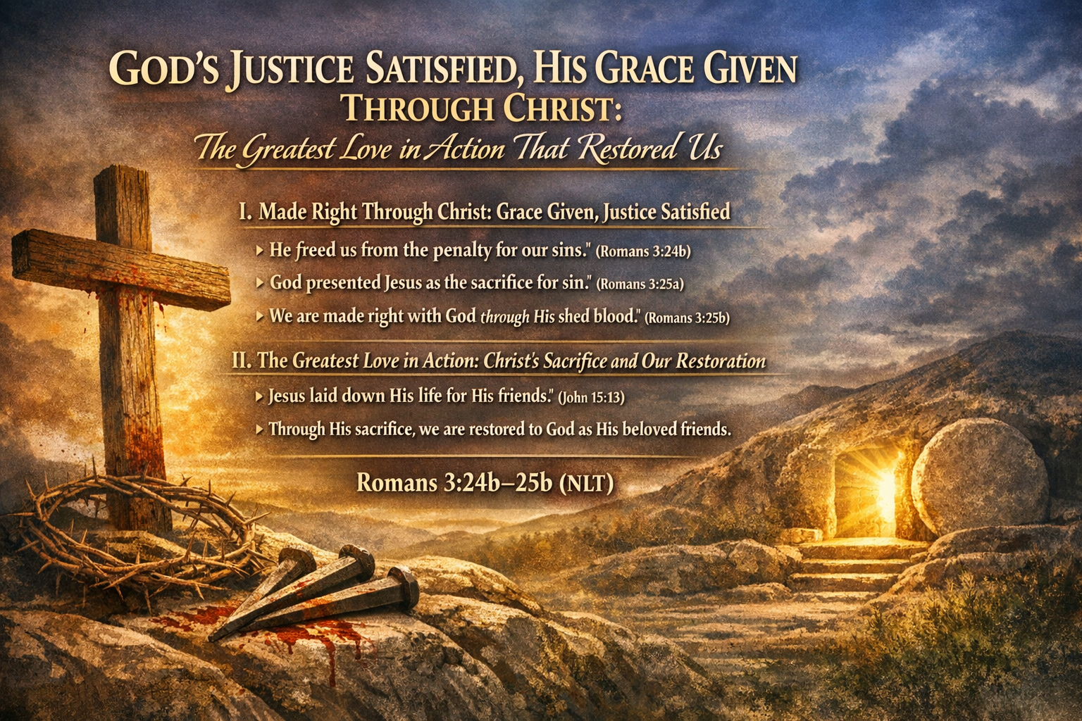Romans 3:24b–25b now shows how God’s grace can make sinners right while His justice remains fully satisfied through Jesus Christ.